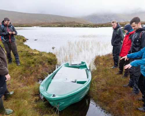 Our team picks a path through some deeply gullied peatland and a brief lull in the showers allows us a glimpse of our destination: a chain of small islands strewn across a loch. Before long we are out on the water, zigzagging in an old rowing boat towards one of the larger islands, where we can see groves of trees growing around the water line.