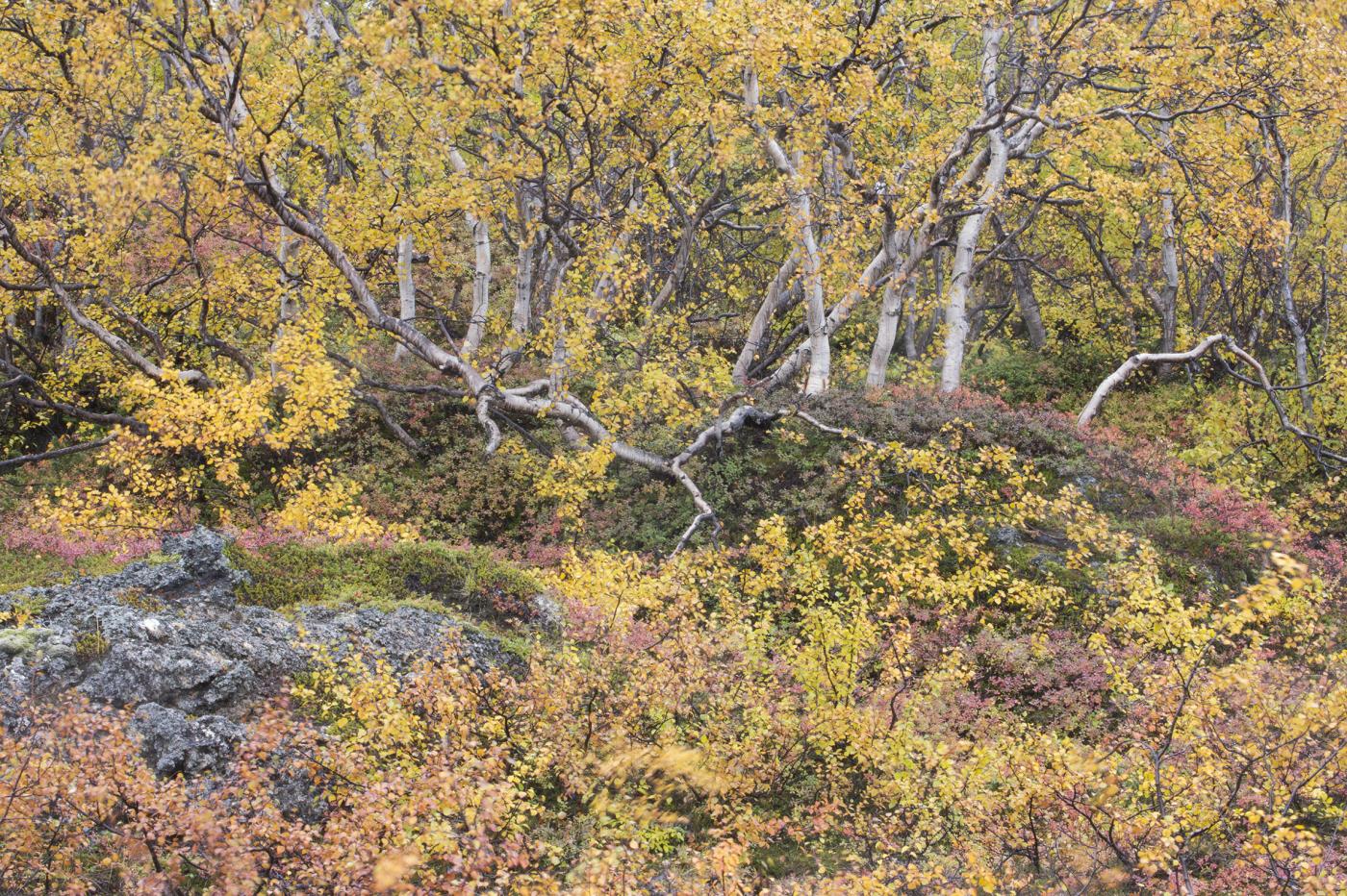 Shaking my head, we wander towards a clump of birches growing on the southern side of the island. Their leaves are already golden, several weeks further into autumn than their counterparts in the glen and, although the trees are only a metre in height, they have thick, multi-stemmed trunks that betray their considerable age. Hanging from their branches, we find our prize – hundreds of catkins hanging like Christmas decorations.