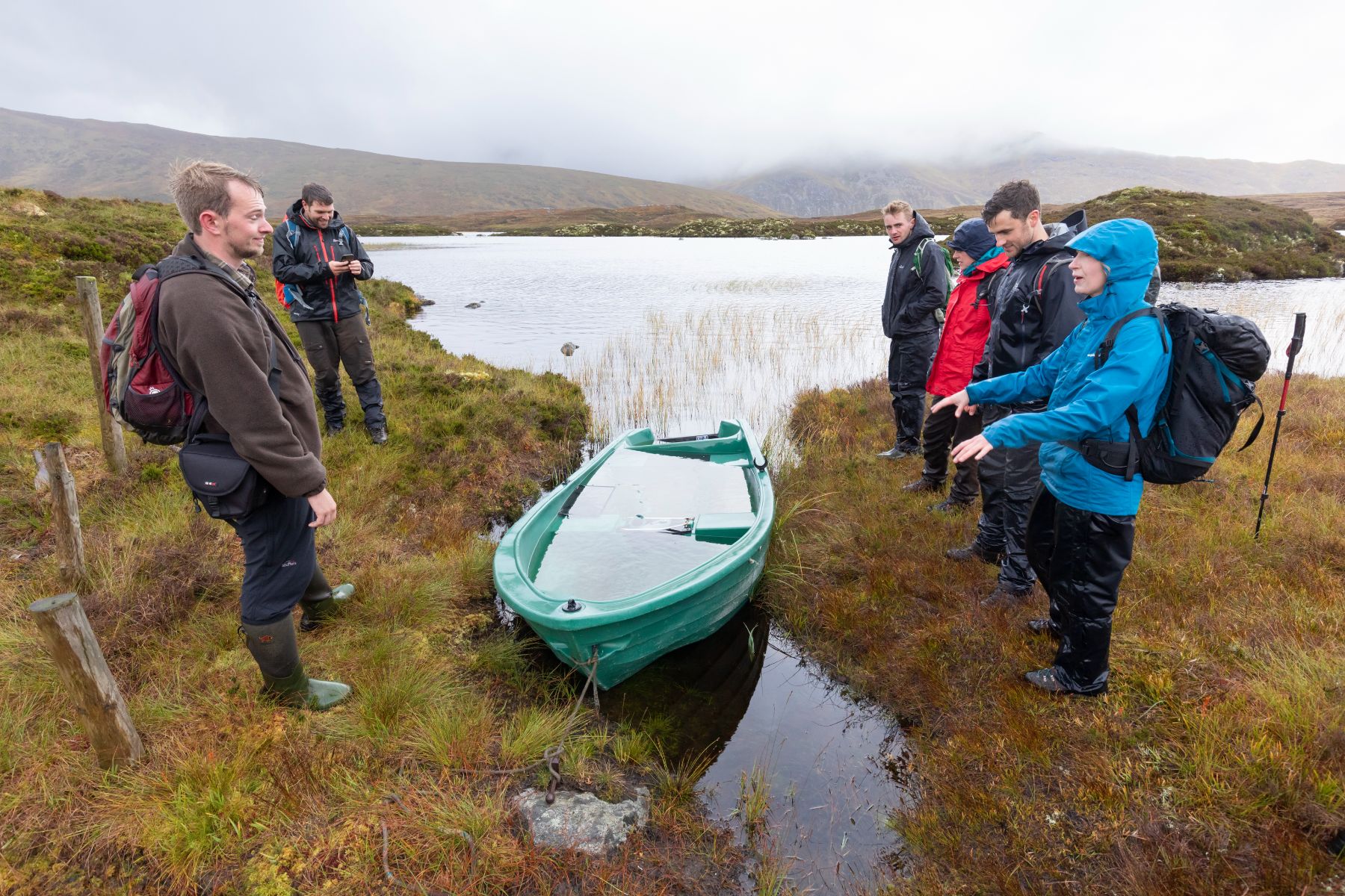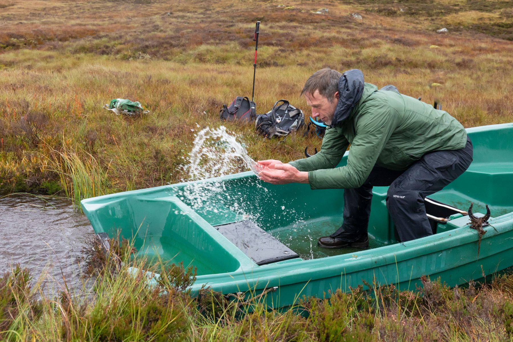 Our team picks a path through some deeply gullied peatland and a brief lull in the showers allows us a glimpse of our destination: a chain of small islands strewn across a loch. Before long we are out on the water, zigzagging in an old rowing boat towards one of the larger islands, where we can see groves of trees growing around the water line.