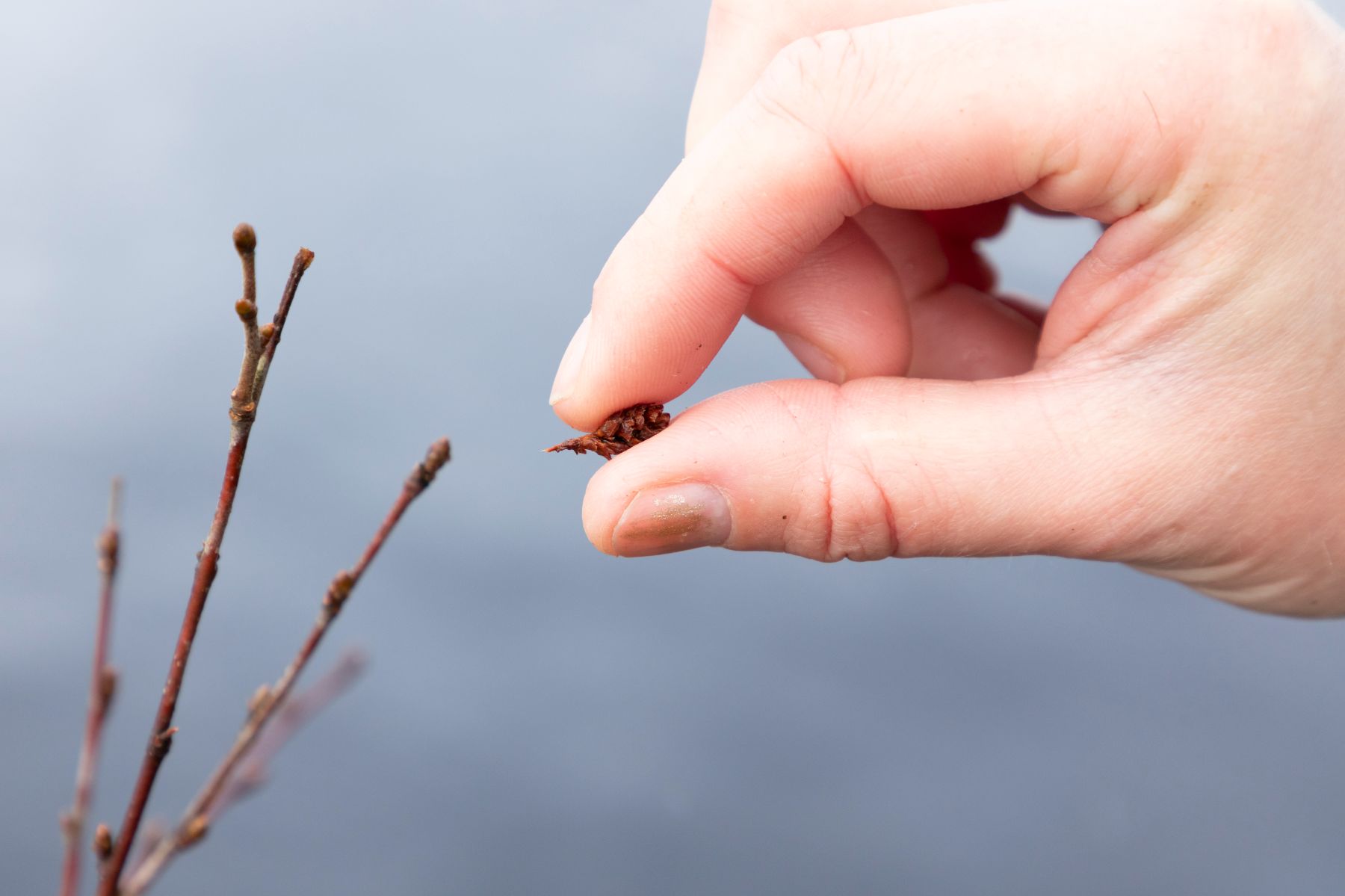 “Have you found any with catkins?” Nicky Hume asks, reminding me that we didn’t just row out here to stare admiringly at the little trees. Catkins are the sexual organs of many tree species: hanging clusters of tiny flowers that are either male or female in form and function. We were targeting female catkins on this trip because at this time of year they will be ripe with seed.